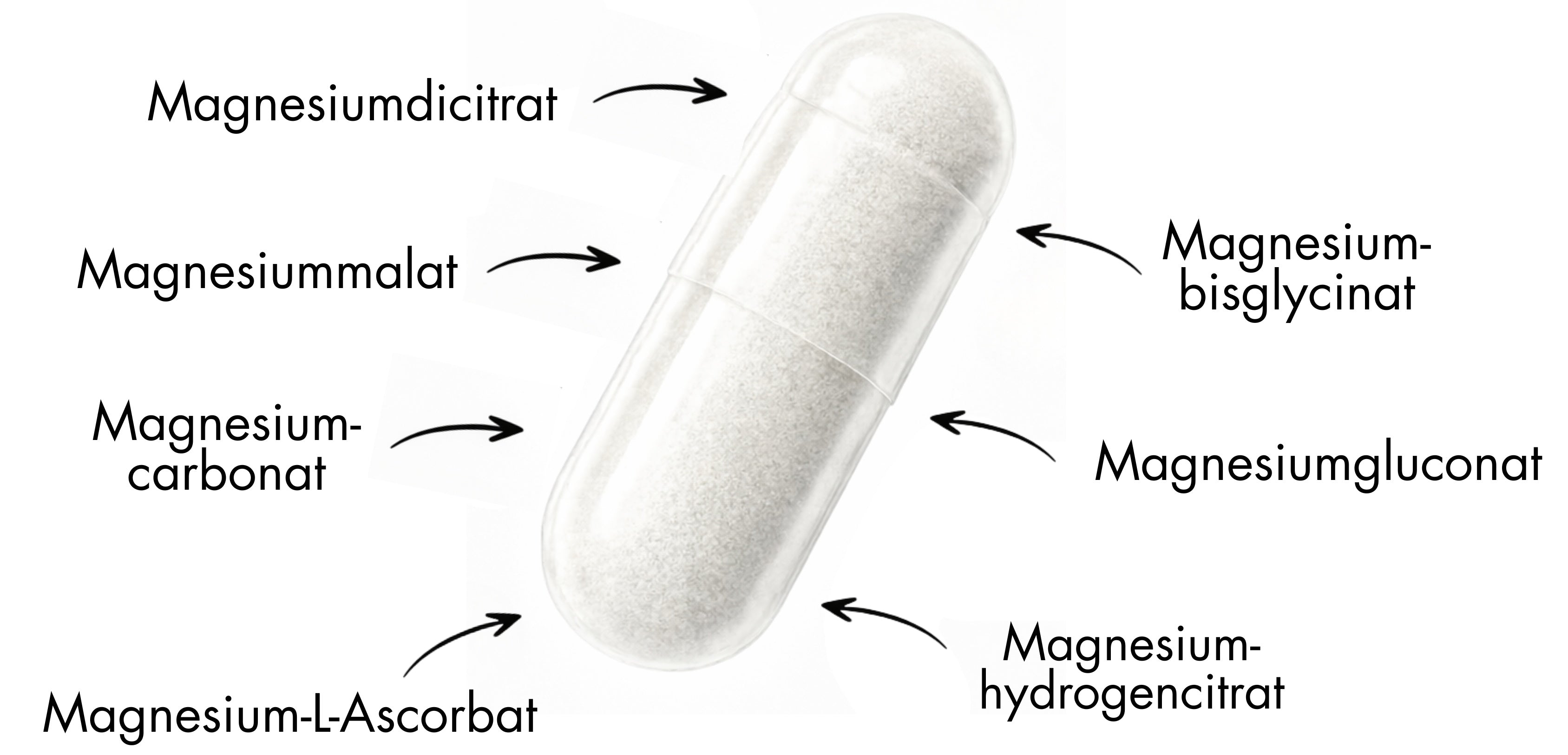Magnesiumdicitrat, Magnesiummalat, Magnesiumcarbonat, Magnesiumbisglycinat, Magnesiumhydrogencitrat, Magnesiumgluconat, Magnesium-L-Ascorbat, Hydroxypropylmethylcellulose (vegane Kapselhülle)